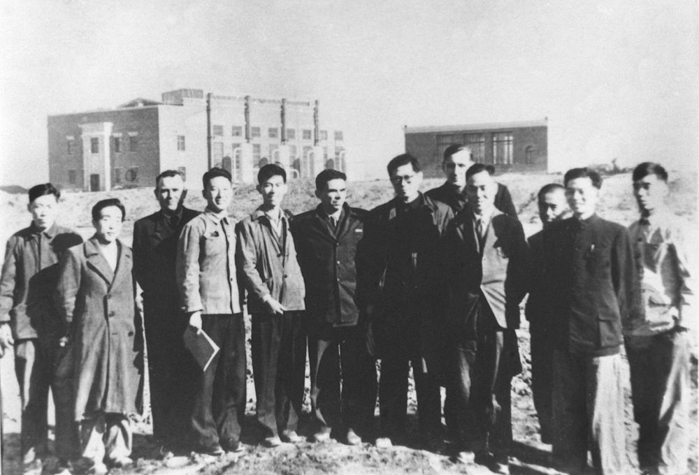 1956年,江澤民同志(左七)在長春第一汽車製造廠同援建一汽的蘇聯專家等合影。新華社發