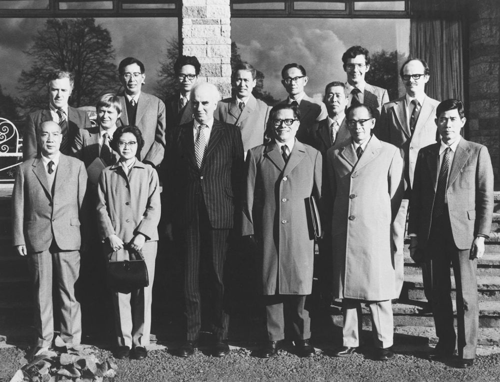 1964年6月,江澤民同志(二排右一)在法國艾克斯萊班出席國際電工委員會會議期間同與會代表合影。新華社發