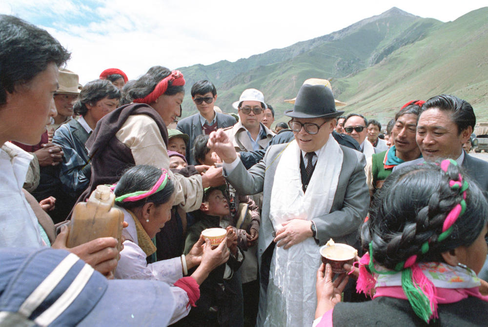 1990年7月25日,江澤民同志與藏族羣眾共慶望果節。新華社發
