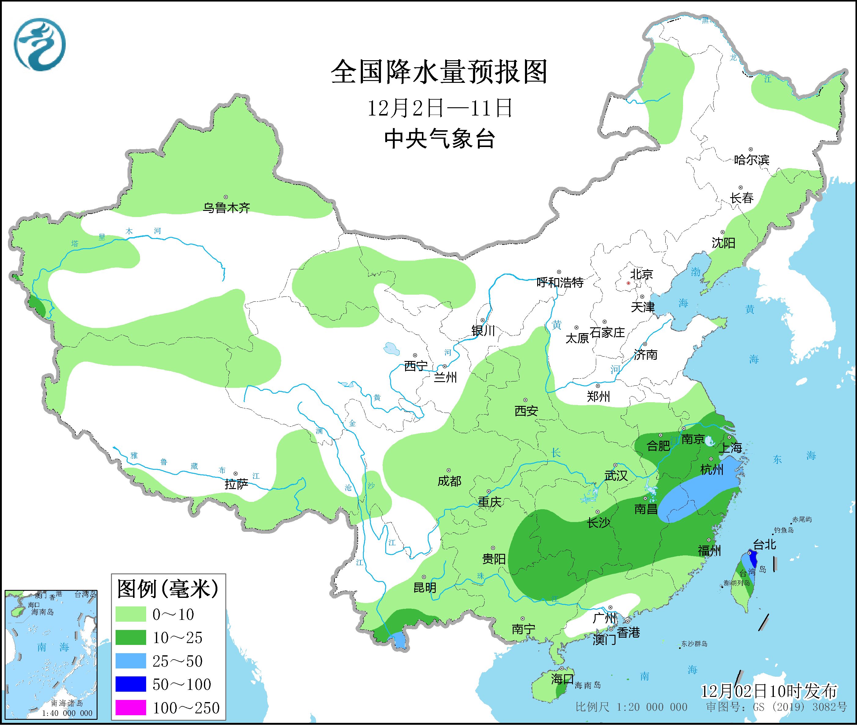 未來10天(12月2-11日),江淮、江南、華南北部累計降水量有8~15毫米,部分地區20~50毫米,基本接近常年同期或略偏多,我國其餘大部地區降水偏少。