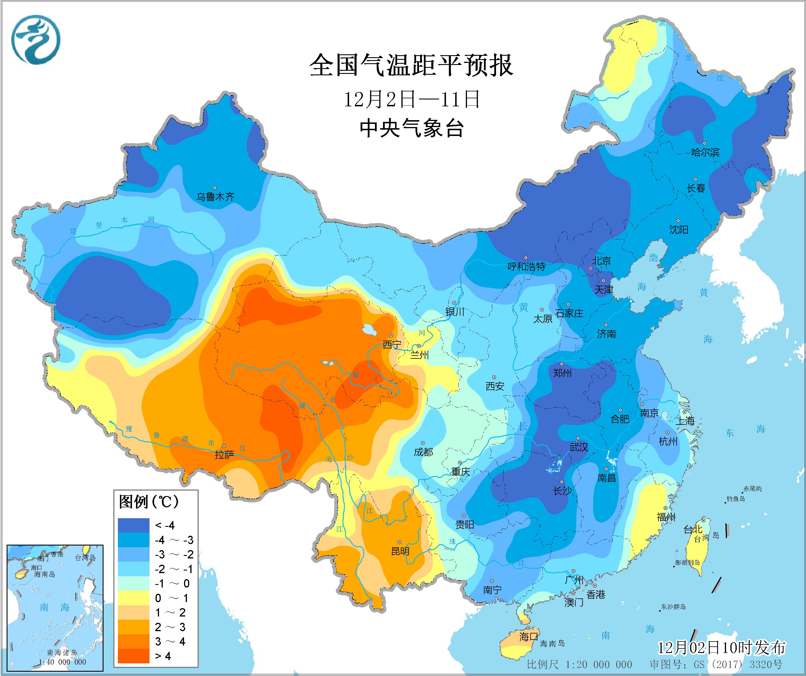 12月2-11日,除青藏高原和雲南等地氣温偏高1~3℃外,我國其餘大部地區平均氣温較常年同期偏低,其中新疆、華北、東北地區、黃淮、江漢、江南中西部、華南西部等地偏低3~5℃。