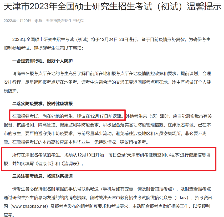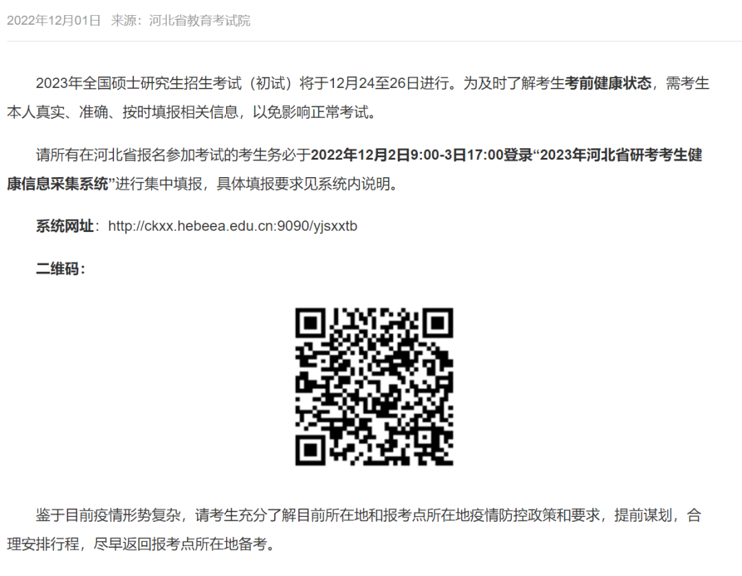 2023年全國碩士研究生招生考試將於2022年12月24日至26日舉行。為幫助大家順利、安全參加考試,現就考試有關注意事項提示如下: