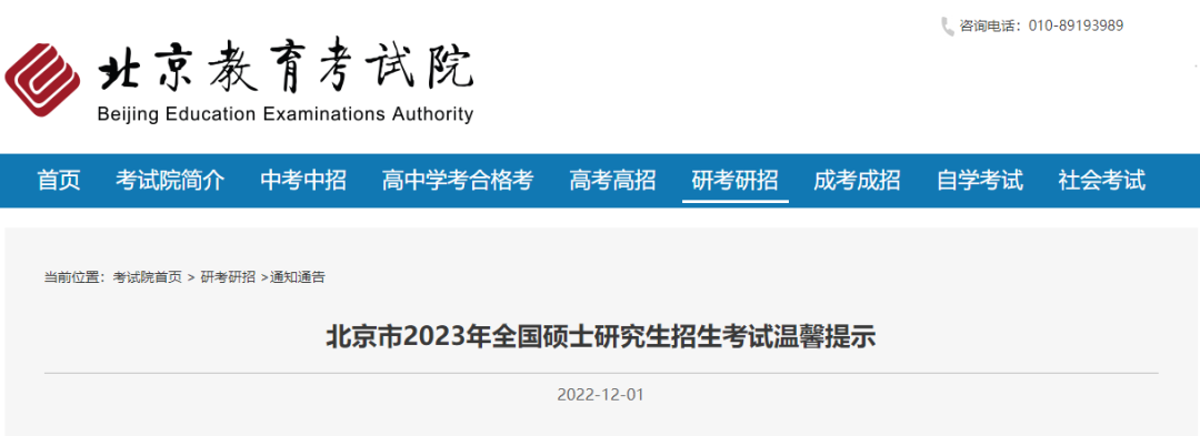 12月1日,北京教育考試院發佈提示,2023年全國碩士研究生招生考試將於2022年12月24日至26日舉行。