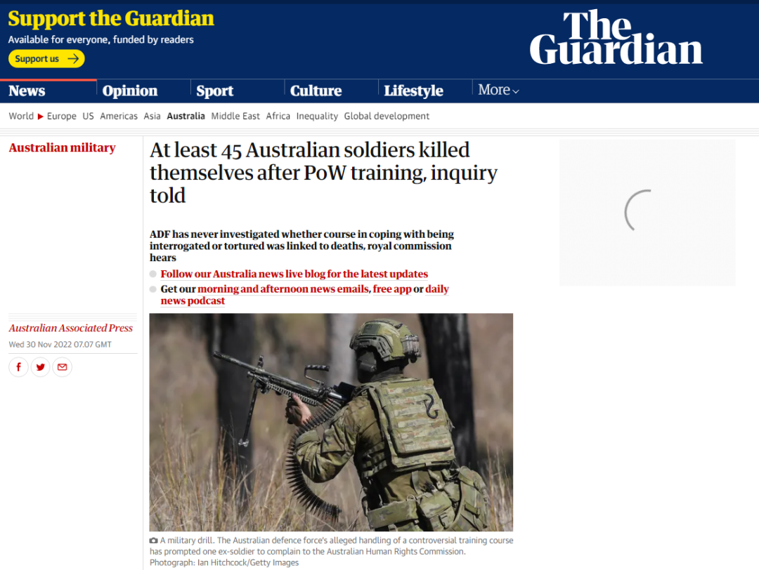 《衞報》稱,澳國防軍從2001年開始實施該訓練計劃,並將其分為A、B、C三個等級。其中,最高等級C級訓練最具爭議,尤其是飽受詬病的模擬審訊環節。德派爾稱,45起自殺事件“極其悲慘”,他已經向澳大利亞人權委員會投訴,並準備向澳聯邦法院提起訴訟。