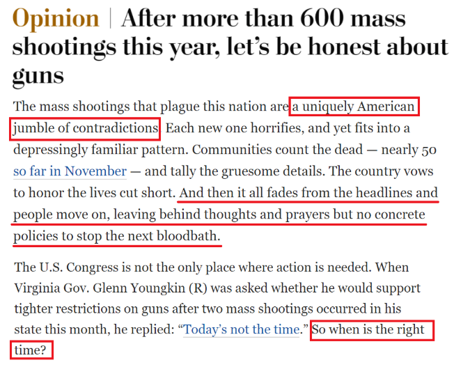 文章説,美國政客在面對槍支暴力事件時,極力避免使用“槍”“火器”或“大容量彈匣”這些詞,但卻毫不猶豫地將精神疾病列為造成“意外事件”的因素。即使研究早就表明,與精神疾病相關的涉槍殺人案只佔所有涉槍殺人案的5%。