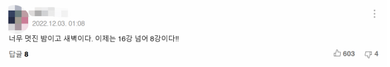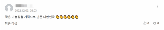 《國民日報》稱,這是自2010年南非世界盃後,韓國隊時隔12年再次晉級16強。當晚,在確認韓國隊成功晉級這一結果時,現場觀眾席上爆發出韓國球迷的歡呼聲,有人在看台上流淚跳躍着為韓國隊慶祝。與此同時,韓國國內網民也為這一賽果振奮不已。他們在相關報道下留言表達自己內心的喜悦和對韓國隊的祝福。有人仍對比賽結果感到神情恍惚,寫道:“這是夢吧?啊哈!進了16強!看到選手們為此全力以赴的樣子我都哭了。選手們辛苦了,我愛你們!”↓