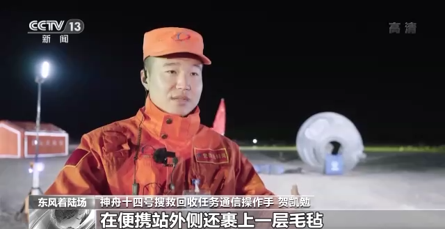 *神舟十四號搜救回收任務通信操作手 賀凱勉:*在便攜站外側還裹上一層毛氈,像嬰兒一樣去呵護它、去愛護它,在線纜上纏上了一些反光標識,(避免)出現人為損壞現象。