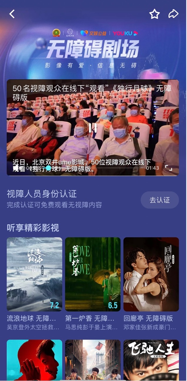 優酷無障礙劇場開通視障身份認證,1700萬視障者可線上免費觀影