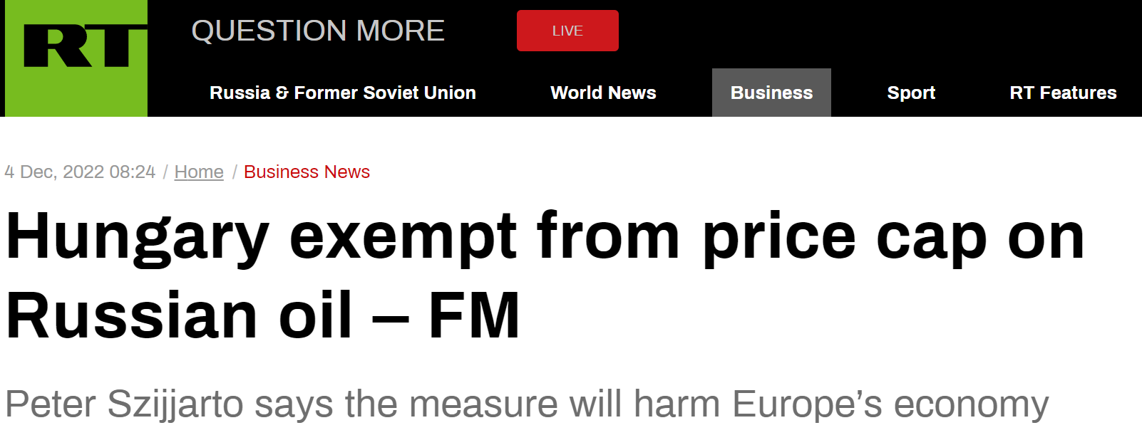 RT稱,根據西雅爾官方臉書賬號發佈的內容,他表示:“在關於石油價格上限的談判中,我們為匈牙利的利益而拼搏,最終,我們取得成功。匈牙利被免除石油價格上限。”