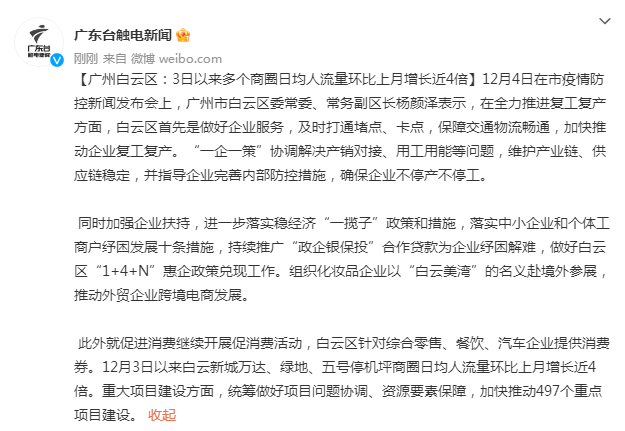 【廣州白雲區:3日以來多個商圈日均人流量環比上月增長近4倍】12月4日在市疫情防控新聞發佈會上,廣州市白雲區委常委、常務副區長楊顏澤表示,在全力推進復工復產方面,白雲區首先是做好企業服務,及時打通堵點、卡點,保障交通物流暢通,加快推動企業復工復產。“一企一策”協調解決產銷對接、用工用能等問題,維護產業鏈、供應鏈穩定,並指導企業完善內部防控措施,確保企業不停產不停工。