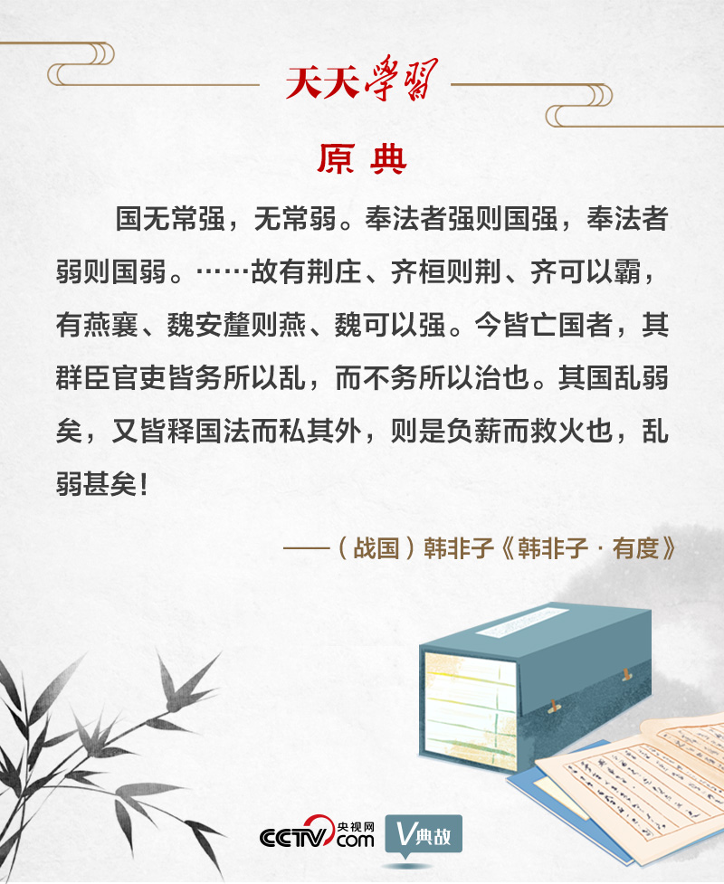 韓非子是戰國時期法家思想的集大成者。“有度”,就是有法度。韓非子把“奉法”作為治亂興亡的關鍵,提出“國無常強,無常弱。奉法者強則國強,奉法者弱則國弱”。意思是,國家不會永遠富強,亦不會長久貧弱。執行法度的人堅決,國家就會富強;執行法度的人軟弱,國家就會貧弱。