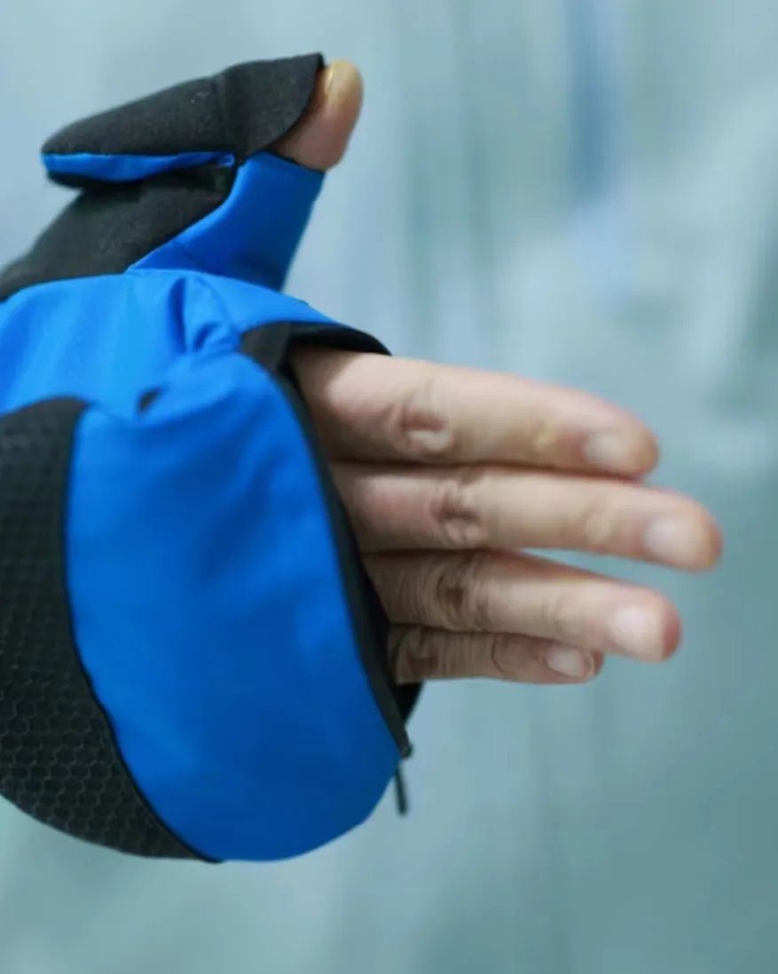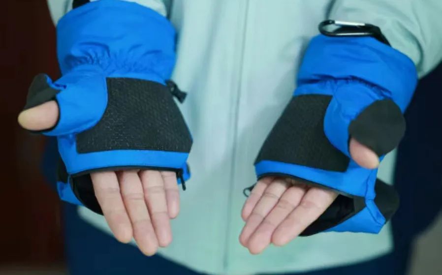 2、當需要完成手部操作時,可通過將拉開掌指關節和拇指關節處拉鍊,將指端手套部分向後摺疊,通過魔術貼固定於手背處,從而使手指全部暴露進行精細化操作動作,也可隨時將手指回縮至手套內取暖;