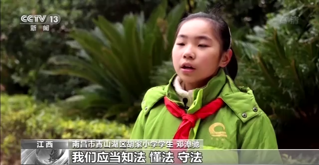 *南昌市青山湖區胡家小學學生鄧漳馳:*作為一名少先隊員,我們應當知法、懂法、守法,遵紀守法應該從小做起,從小事做起。我也會把我今天學習到的法律知識告訴給更多的人,讓大家一起知法、懂法、守法。