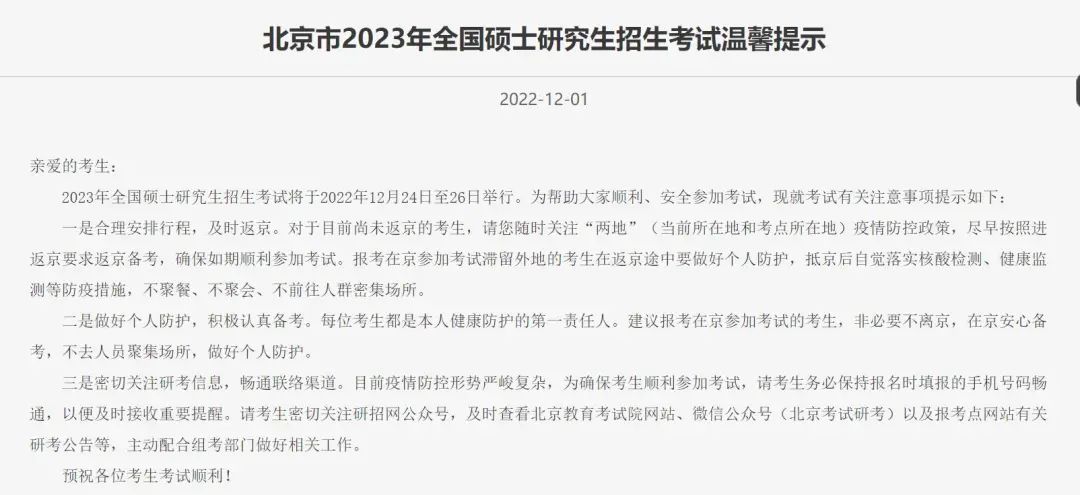 如北京教育考試院 12月1日發佈温馨提示,對於目前尚未返京的考生,隨時關注當前所在地和考點所在地疫情防控政策,儘早按照進返京要求返京備考,確保如期順利參加考試。