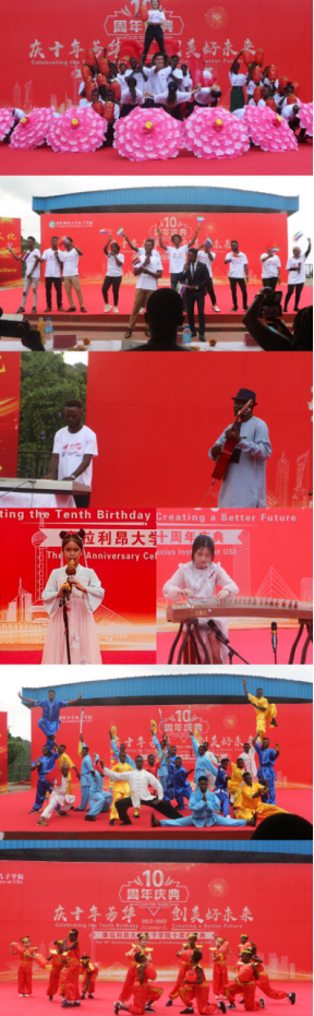 在慶典活動中,塞大孔院師生為到場嘉賓帶來了中塞特色文藝節目。快閃節目以中文歌曲串燒的形式,帶大家追憶與塞大孔院的故事。開場舞《盛世歡歌》將絲綢扇、花傘舞、燈籠舞、現代舞融合,隆重拉開慶典活動的序幕。中外樂器連奏,用不同的音符奏出中塞友好之聲。弗拉灣學院附中和附小兩個孔子課堂的學生邊誦《三字經》、邊打太極拳,展現了較好的漢語水平和對中國武術的喜愛。武術俱樂部成員帶來少林棍、少林槍、拳術、彩龍、舞獅等不同武術套路表演,引得現場觀眾掌聲不斷。弗拉灣學院漢語專業本科生表演音樂情景劇《聽我説謝謝你》,深情訴説塞拉利昂學生對塞大孔院的感恩之情。一支《中塞少年》燈籠舞,舞出了中塞少兒情誼和中塞美好未來。原創民族歌舞《塞拉利昂歡迎您》節目中,本土師生伴隨激情昂揚的非洲鼓點盡情舞動,展示了熱情奔放的塞拉利昂本土文化。全體教師手持中塞國旗齊聲獻唱《瀚宇之花盛開》,表達了對漢教事業的熱愛和不懈追求。本土師生傾情創作《塞大孔院十週年之歌》,以節奏鮮明的中英説唱講述塞大孔院的鮮活生機和蓬勃發展。現場氣氛熱烈非凡,精心編排的特色節目讓觀眾欣賞到了一場中塞文化交相輝映的視聽盛宴。