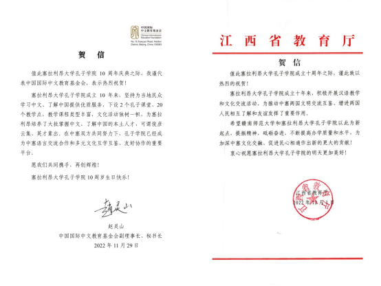 此外,荊曼院長宣讀中國國際中文教育基金會、江西省教育廳發來的賀信,他們對塞大孔院十年來在推廣中國語言文化、溝通中塞人民情誼方面所取得的成績給予充分肯定,對孔院的未來發展寄予厚望。