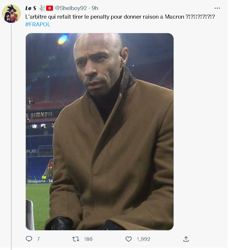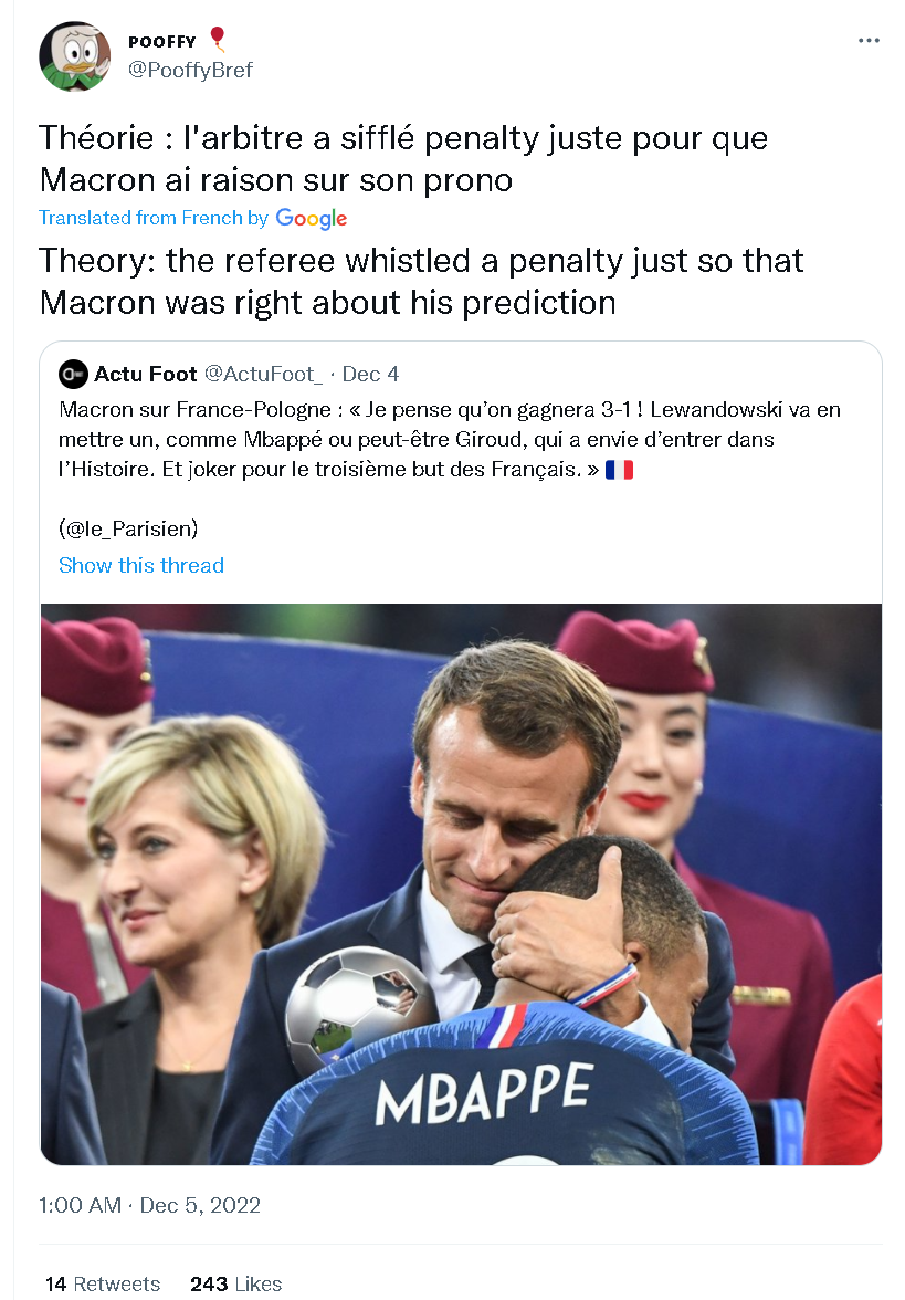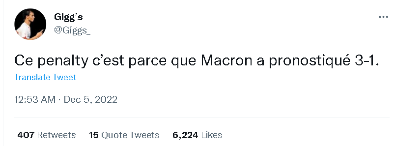 如下圖所示,在國外的社交平台“推特”上,不少法國網民就發帖玩梗説,波蘭隊之所以會在與法國隊的最後幾分鐘裏被裁判給了一個點球,是因為馬克龍預測了3比1的比分。