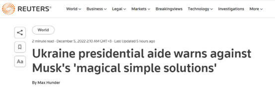 對於波多利亞克這一比較,路透社認為,他提到的顯然是馬斯克在接管推特後推出的一系列改革計劃,以及他此前就烏克蘭局勢提出的“俄烏和平計劃”,呼籲烏克蘭放棄克里米亞半島,以換取和平。