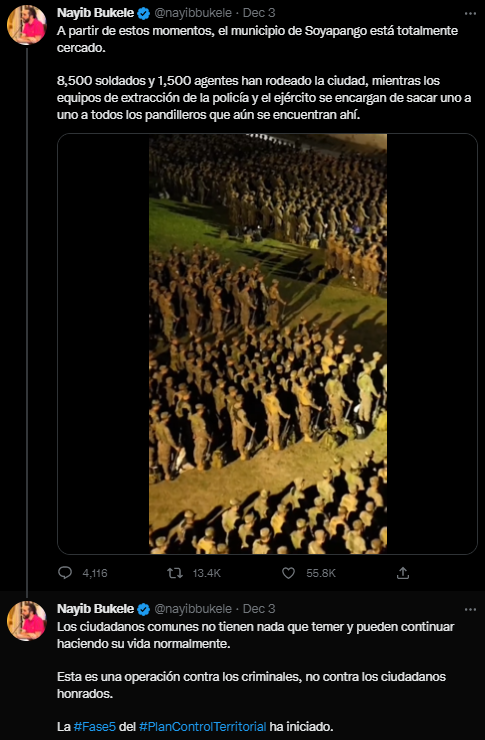 “此時此刻,索亞潘戈市已被完全包圍,”布克爾12月3日在社交媒體推特上發文稱,“來自警方和軍隊的行動小組任務是逐個搜出仍在那裏的所有幫派成員。”BBC稱,他補充説,普通民眾無需感到害怕,因為這一行動是“針對罪犯的行動,而非針對公民。”文字下方,布克爾配上了行動視頻和照片,BBC稱,畫面顯示,全副武裝的行動人員身穿防彈衣,手持槍械、在城外等待。↓