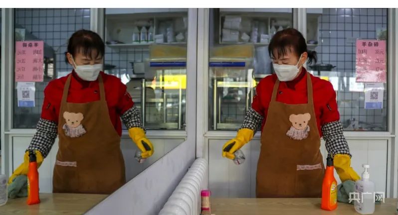 一名店員正在消毒,為開業做準備(央廣網記者 賈海元 攝)