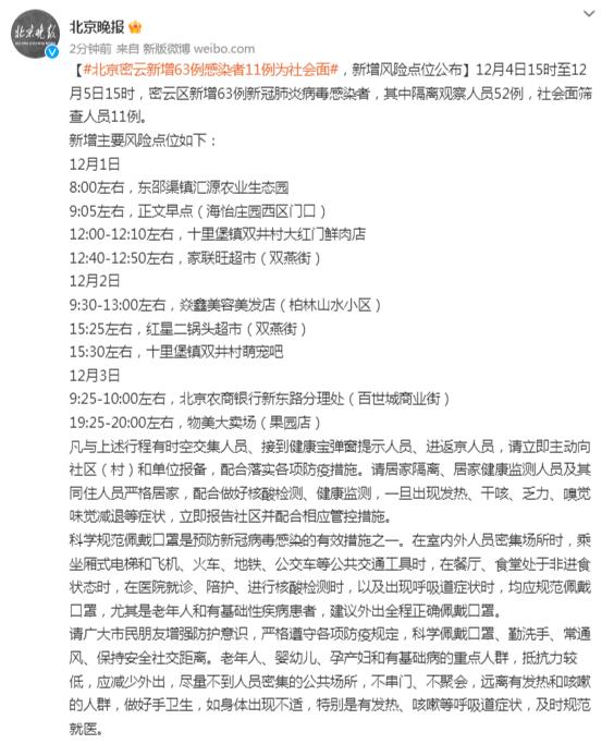 12月4日15時至12月5日15時,密雲區新增63例新冠肺炎病毒感染者,其中隔離觀察人員52例,社會面篩查人員11例。