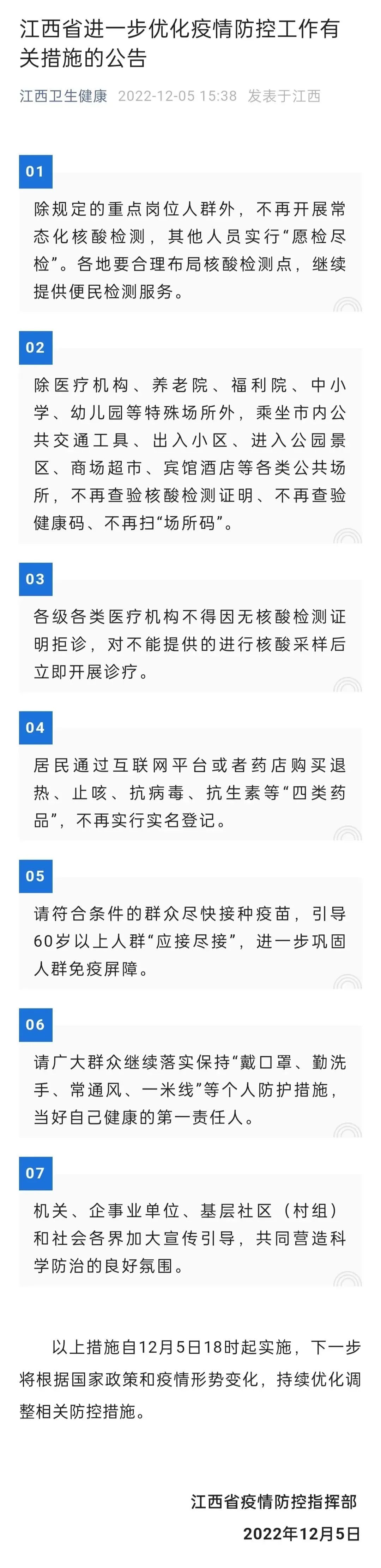 12月5日下午,“江西衞生健康”微信公眾號消息,自12月5日18時起,江西省不再開展常態化核酸檢測;乘坐市內公共交通工具、出入小區、進入公園景區、商場超市、賓館酒店等各類公共場所,不再查驗核酸檢測證明 、不再查驗健康碼、不再掃“場所碼”;居民通過互聯網平台或者藥店購買退熱、止咳、抗病毒、抗生素等“四類藥品”,不再實行實名登記。