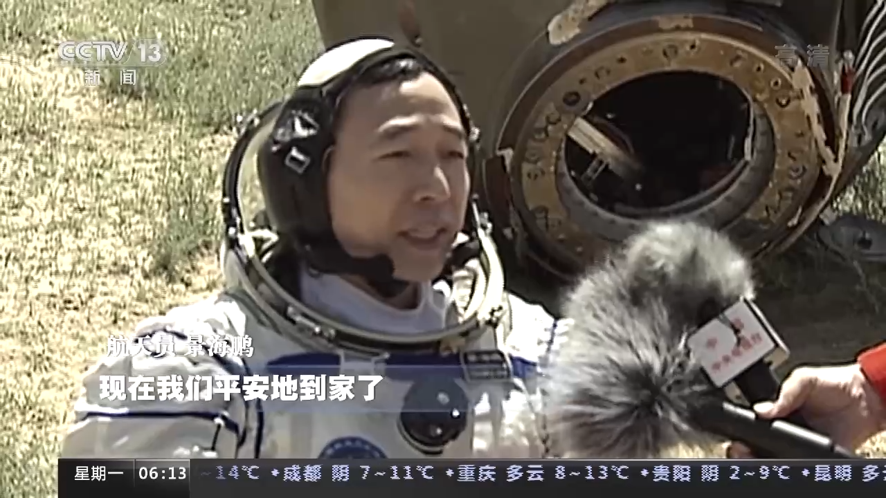 *航天員 景海鵬:*我們圓滿順利地完成了我國首次載人交會對接任務,現在我們平安地到家了。