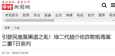 台媒:引發民進黨黑道之亂的“綠二代”趙介佑欺詐販毒案二審將宣判