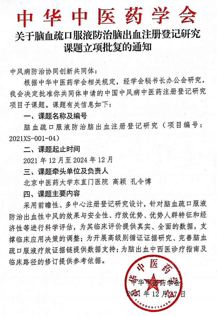 為了推動腦血疏口服液防治原發性腦出血的效果與安全性、療效優勢、優勢人羣特徵和經濟性等方向的科學評估,讓其臨牀評價具備更加真實、全面的數據,以支撐臨牀應用決策的調整並提供高級別循證證據研究、完善腦血疏口服液療效及安全性證據鏈,為腦出血中西醫診療指南及臨牀路徑的修訂提供參考依據,北京中醫藥大學東直門醫院與山東沃華醫藥科技股份有限公司共同合作了《腦血疏口服液防治腦出血註冊登記研究》項目,項目獲得中華中醫藥學會立項,計劃50家臨牀研究中心參與,完成2000例病例觀察。