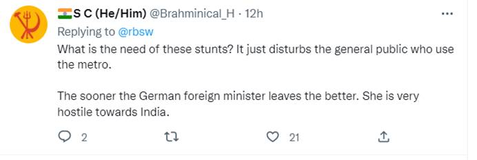 不過,對於貝爾伯克此次訪問印度並乘坐地鐵一事,有些印度網友持不同意見。有網友對她表示歡迎,但也有印度網友認為她此舉是“噱頭”,只會擾亂交通,並認為她應當儘快離開印度:“這些噱頭有什麼必要呢?這隻會擾亂使用地鐵的普通大眾。德國外長越早離開越好。她對印度非常不友善。”↓
