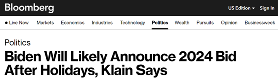 彭博社報道還稱,拜登和家人關於是否參選的討論將在聖誕節假期繼續。據美國福克斯新聞網此前報道,拜登11月底在馬薩諸塞州楠塔基特島度感恩節假期時表示,他還沒有就是否在2024年競選連任與家人進行任何交談。