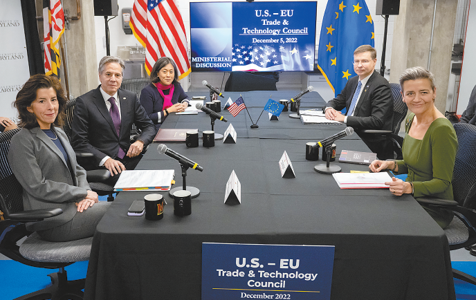 5日,美國-歐盟貿易和技術委員會在馬里蘭州召開第三次會議,與會者包括美國國務卿布林肯、商務部長雷蒙多、美國貿易代表戴琪,以及歐盟委員會執行副主席東布羅夫斯基斯和韋斯塔格。路透社稱,該會議框架成立於一年前,前兩次會議的重點是“監管合作和建設針對中國非市場經濟行為的統一戰線”。但在今年的會議上,歐盟高級官員打算向美國同行“大聲抱怨”拜登政府的《通脹削減法案》將歐洲生產的汽車排除在税收減免之外。