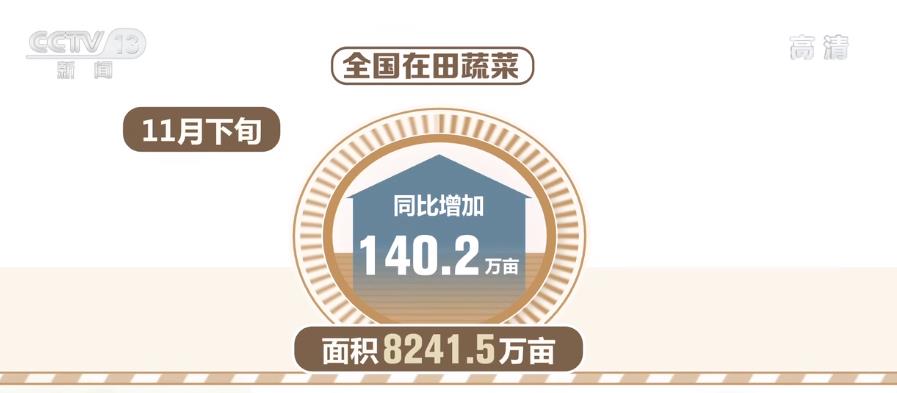從供應量看,當前,“菜籃子”產品總量充足。全國蔬菜主要品種長勢正常,面積產量均有所增加,11月下旬在田蔬菜面積8241.5萬畝、同比增加140.2萬畝,產量2414.2萬噸、同比增加65.3萬噸。水果產量處於高位,生豬生產仍在增長。