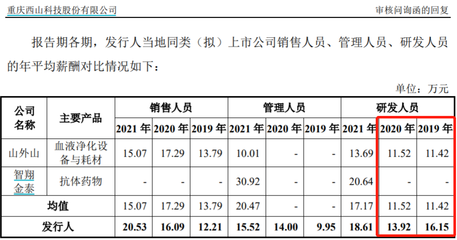 但與此同時,《審核問詢函的回覆》中披露,西山科技的研發人員平均薪酬在2019年和2020年分別為16.15萬元和13.92萬元,也即在2020年出現了將近15%的下降,這也意味着在2020年發生的“部分研發人員基於個人職業發展考慮選擇離職”事項,離職的研發人員多為薪酬水平較高的高級別研發人員。