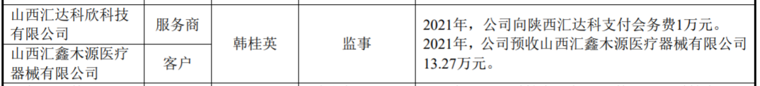不僅如此,“山西匯鑫木源醫療器械有限公司”的監事韓桂英,同時也是“山西匯達科欣科技有限公司”的監事,2021年西山科技曾向“山西匯達科欣科技有限公司”支付會務費1萬元,這家公司註冊成立於2021年3月,截止到2021年末該公司的實繳資本為零、員工社保繳納記錄為零。