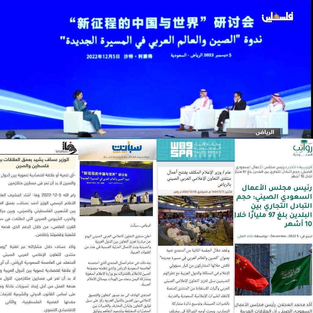 當地時間12月5日,由中國中央廣播電視總枱發起、30多家阿拉伯國家主流媒體參與的“新徵程的中國與世界”中阿媒體研討會在沙特阿拉伯首都利雅得成功舉辦。來自沙特、埃及、阿爾及利亞、巴勒斯坦、也門的政府官員、主流媒體負責人、相關機構代表與中國外交部中阿合作論壇事務大使等百餘人,圍繞新時代中國的新徵程與阿拉伯國家的新機遇、推動構建中阿命運共同體的重要意義、中阿媒體如何推動中阿關係朝着更好方向發展等議題,展開深入交流和探討。與會人士普遍認為,中共二十大擘畫了中國未來發展的藍圖,將為阿拉伯國家發展提供參考與借鑑,中阿媒體加強交流合作將助力中阿關係邁上更高水平。
