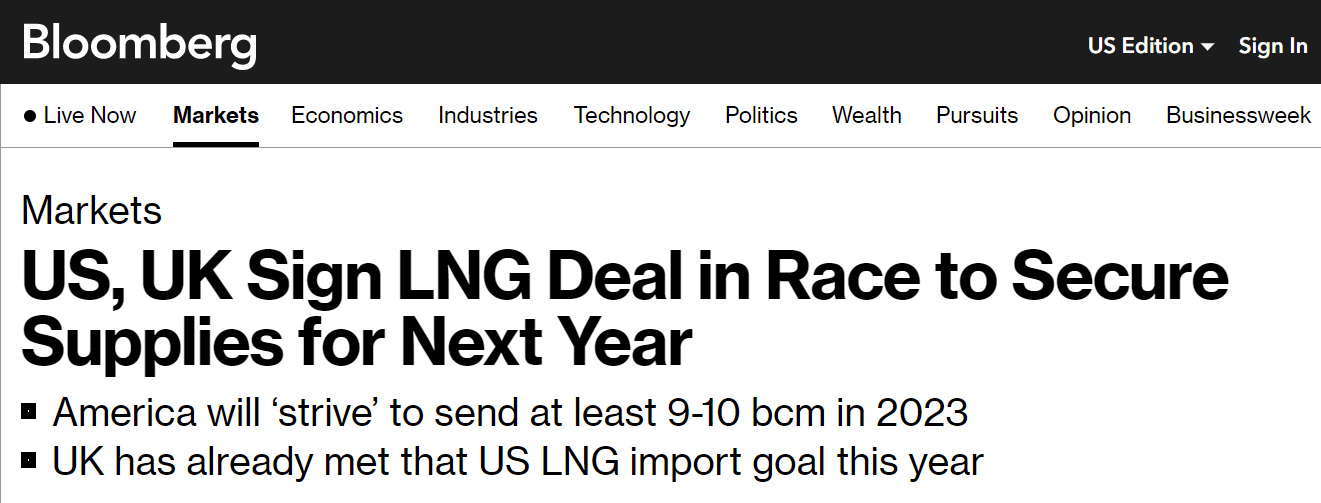 聯合聲明稱,兩國將確保美國在未來一年中通過英國港口出口至少90億至100億立方米的液化天然氣,這一數字超過2021年出口水平的兩倍,並利用了英國先進的進口基礎設施,於英國和歐洲而言,這對於明年補充天然氣儲備有益。