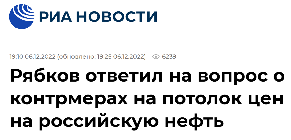【環球網報道 見習記者 李詩睿】綜合俄羅斯衞星通訊社及俄新社12月6日消息,俄羅斯外交部副部長里亞布科夫當天表示,西方國家需要有所準備,俄羅斯必然會在西方對俄石油限後出台反制措施。