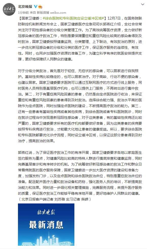 郭燕紅説,為了保證醫療救治工作的有序開展,國家衞健委要求各地以家庭醫生簽約服務為重點,對健康風險比較高的特殊人羣進行摸底排查和健康監測,同時完善基層首診和有序轉診的機制。為了統籌做好新冠感染者的救治工作和羣眾日常看病就醫的醫療服務保障,國家衞健委進一步加大醫療資源的建設和準備力度,加強發熱門診,以及定點醫院和綜合醫院救治牀位,特別是重症救治牀位的準備。配足配齊醫療力量和救治設備和藥物,強化醫務人員的培訓,不斷提高救治能力和效果。同時進一步細化相關管理措施,完善服務流程,來提升醫療服務的質量,保證醫療救治工作能夠平穩有序地開展,更好地維護人民羣眾的健康。(北京日報客户端記者 劉蘇雅 實習記者 柴嶸)