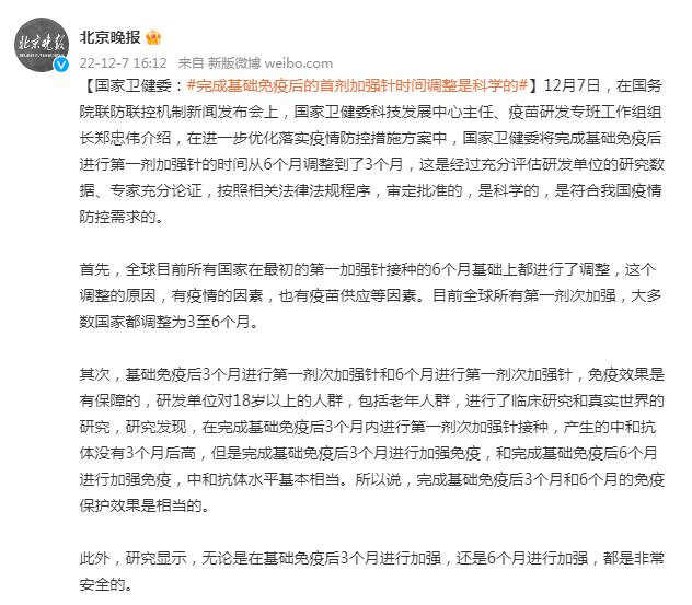 12月7日,在國務院聯防聯控機制新聞發佈會上,國家衞健委科技發展中心主任、疫苗研發專班工作組組長鄭忠偉介紹,在進一步優化落實疫情防控措施方案中,國家衞健委將完成基礎免疫後進行第一劑加強針的時間從6個月調整到了3個月,這是經過充分評估研發單位的研究數據、專家充分論證,按照相關法律法規程序,審定批准的,是科學的,是符合我國疫情防控需求的。