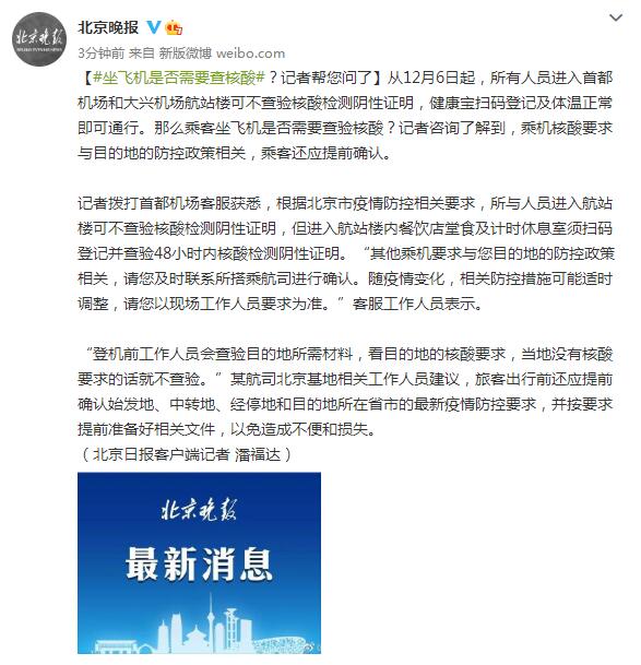 從12月6日起,所有人員進入首都機場和大興機場航站樓可不查驗核酸檢測陰性證明,健康寶掃碼登記及體温正常即可通行。那麼乘客坐飛機是否需要查驗核酸?記者諮詢瞭解到,乘機核酸要求與目的地的防控政策相關,乘客還應提前確認。