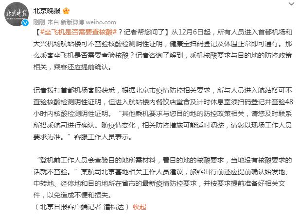 從12月6日起,所有人員進入首都機場和大興機場航站樓可不查驗核酸檢測陰性證明,健康寶掃碼登記及體温正常即可通行。那麼乘客坐飛機是否需要查驗核酸?記者諮詢瞭解到,乘機核酸要求與目的地的防控政策相關,乘客還應提前確認。