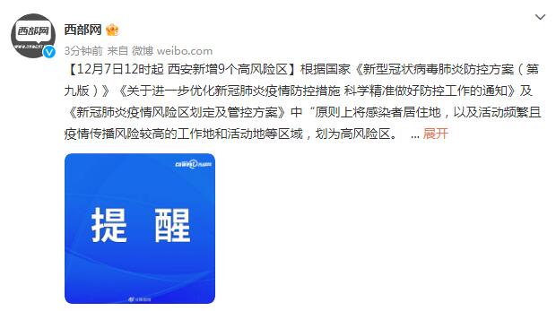根據國家《新型冠狀病毒肺炎防控方案(第九版)》《關於進一步優化新冠肺炎疫情防控措施 科學精準做好防控工作的通知》及《新冠肺炎疫情風險區劃定及管控方案》中“原則上將感染者居住地,以及活動頻繁且疫情傳播風險較高的工作地和活動地等區域,劃為高風險區。高風險區一般以單元、樓棟為單位劃定。在疫情傳播風險不明確或存在廣泛社區傳播的情況下,可適度擴大高風險區劃定範圍。風險區域範圍可根據流調研判結果動態調整”等風險區劃分標準,經市、區(縣)專家研判,西安市新冠肺炎疫情防控指揮部研究決定,自2022年12月7日12時起,劃定高風險區9個:
