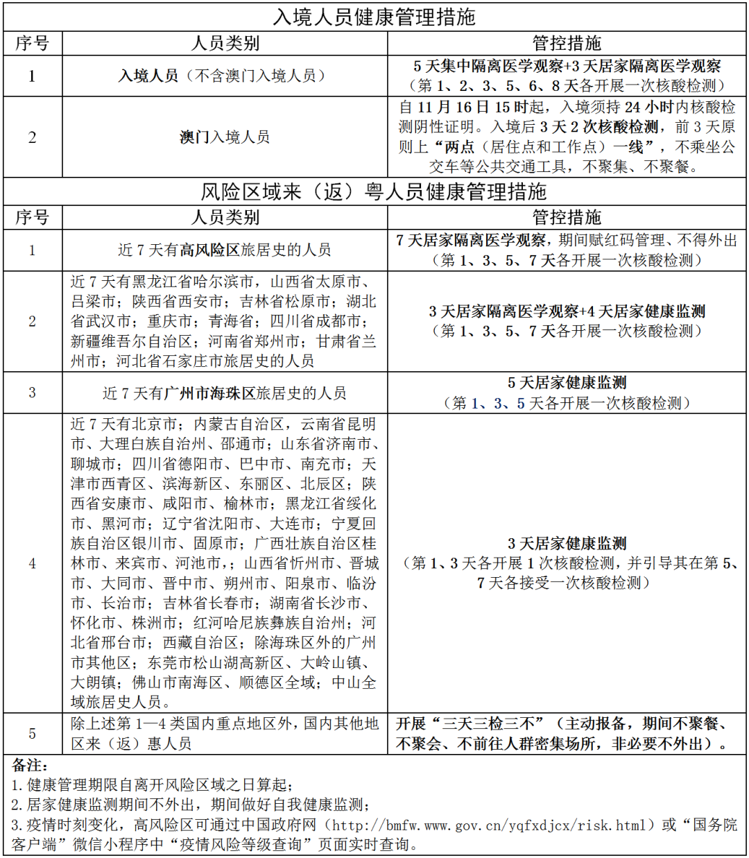 高風險區、疫情傳播嚴重地等來(返)惠人員嚴格按照我市防疫政策配合做好健康管理(詳見以下表格),其他地區來(返)惠人員抵惠後落實“三天三檢三不”(核酸三天每天一檢,期間不聚餐、不聚會、不前往人羣密集場所,謝絕訪客)。