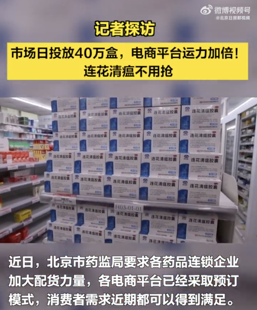據北京晚報消息,記者從北京市藥監局瞭解到,為了滿足市民的購藥需求,北京市每日投放市場“連花清瘟”顆粒和膠囊 共40萬盒左右, 優先面向開設在居民社區、超市內等人流密集、銷售能力強的藥店,以及社區衞生服務中心供貨,並將逐步擴展至北京市所有藥店。