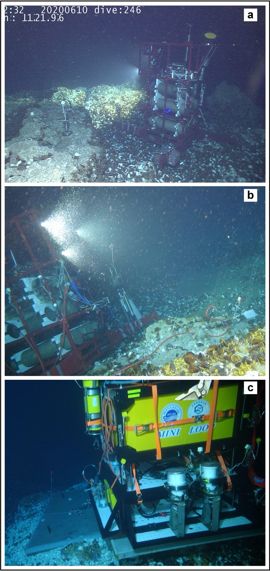 △Mulit-RiPs搭載LOOP連續三年(a:2020年;b:2021年;c:2022年)布放於我國南海北部冷泉區域開展深海原位長期觀測與現場實驗