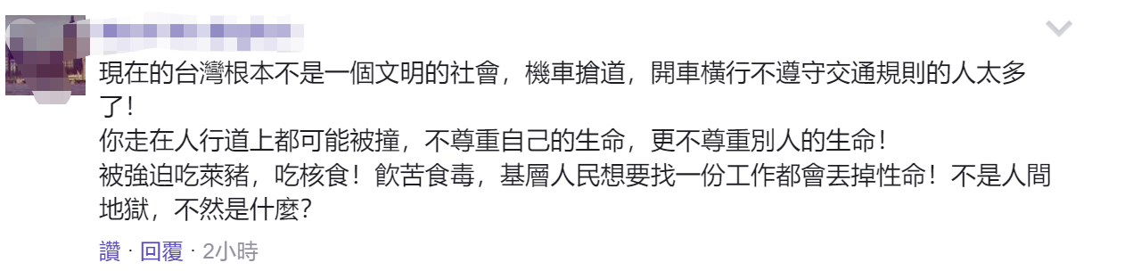 有島內網友表示認同CNN的報道:“現在的台灣根本不是一個文明的社會,摩托車搶道,開車橫行不遵守交通規則的人太多了!你走在人行道上都可能被撞,不尊重自己的生命,更不尊重別人的生命!被強迫吃萊豬,吃核食!飲苦食毒,基層人民想要找一份工作都會丟掉性命!不是人間地獄,不然是什麼?”↓