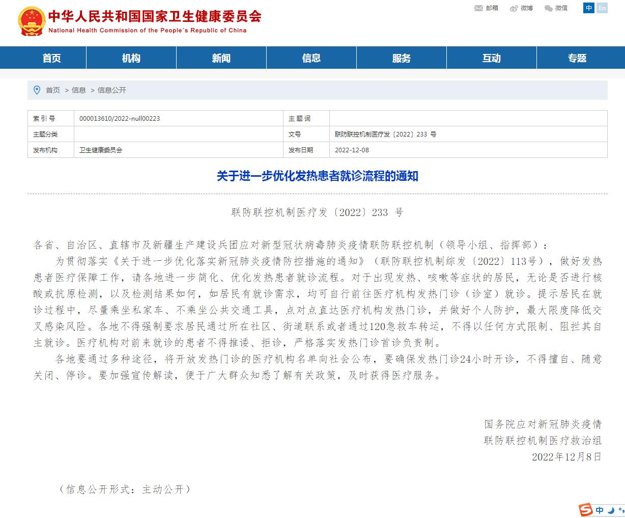 為貫徹落實《關於進一步優化落實新冠肺炎疫情防控措施的通知》(聯防聯控機制綜發〔2022〕113號),做好發熱患者醫療保障工作,請各地進一步簡化、優化發熱患者就診流程。對於出現發熱、咳嗽等症狀的居民,無論是否進行核酸或抗原檢測,以及檢測結果如何,如居民有就診需求,均可自行前往醫療機構發熱門診(診室)就診。提示居民在就診過程中,儘量乘坐私家車、不乘坐公共交通工具,點對點直達醫療機構發熱門診,並做好個人防護,最大限度降低交叉感染風險。各地不得強制要求居民通過所在社區、街道聯繫或者通過120急救車轉運,不得以任何方式限制、阻攔其自主就診。醫療機構對前來就診的患者不得推諉、拒診,嚴格落實發熱門診首診負責制。