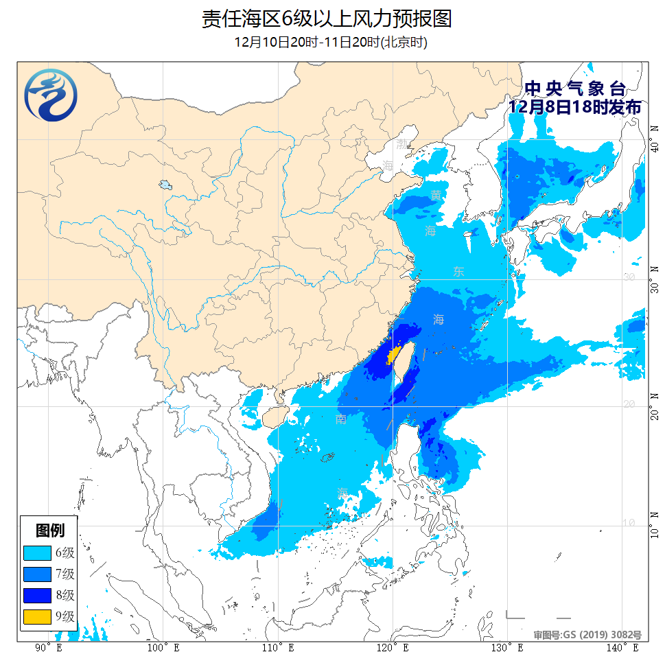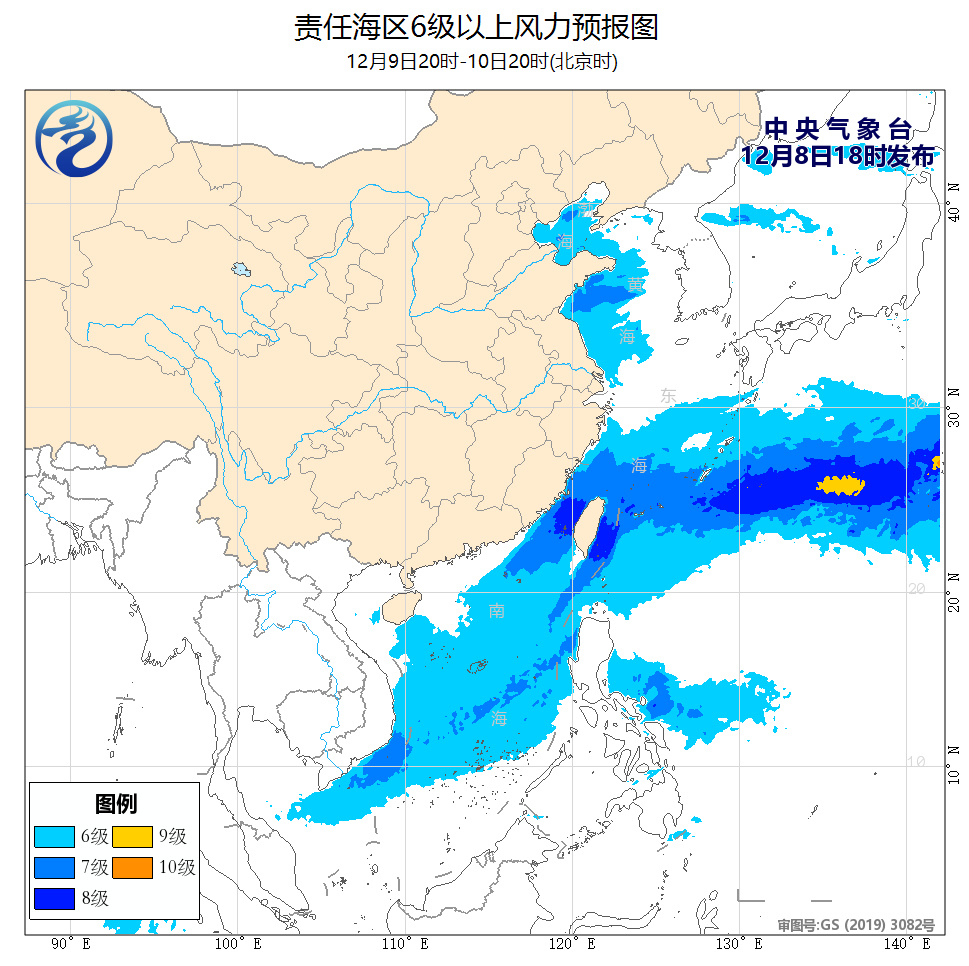 8日夜間至9日夜間,東海南部海域、台灣海峽、台灣以東洋麪、巴士海峽、南海大部海域將有6~7級、陣風8~9級的偏北或東北風,其中東海南部和台灣海峽的部分海域風力可達8~9級、陣風10級。為此,中央氣象台12月8日18時繼續發佈《海上大風預報》。