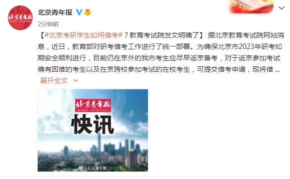 據北京教育考試院網站消息,近日,教育部對研考借考工作進行了統一部署。為確保北京市2023年研考如期安全順利進行,目前仍在京外的我市考生應儘早返京備考,對於返京參加考試確有困難的考生以及在京跨校參加考試的在校考生,可提交借考申請,現將借考有關事項公告如下: